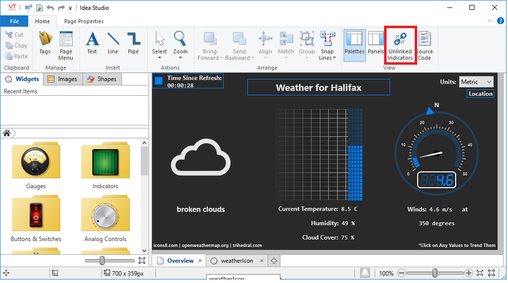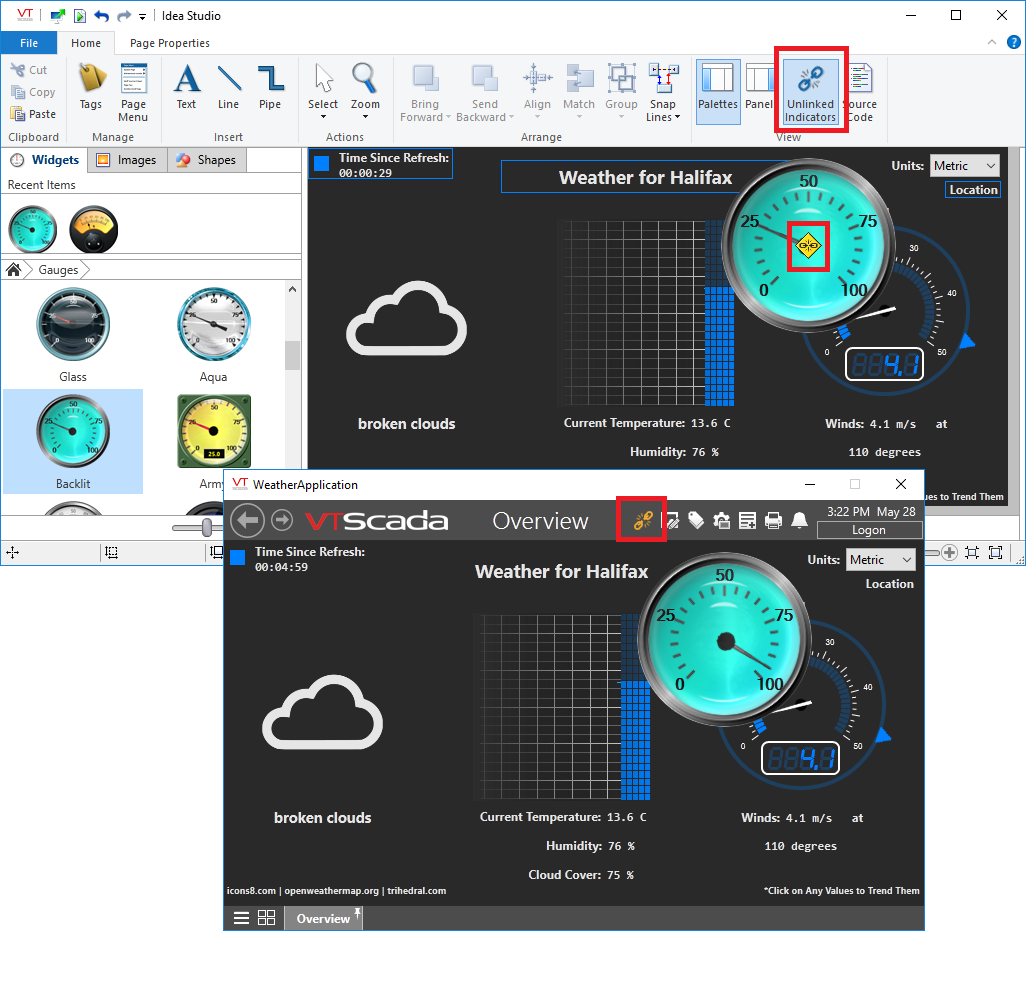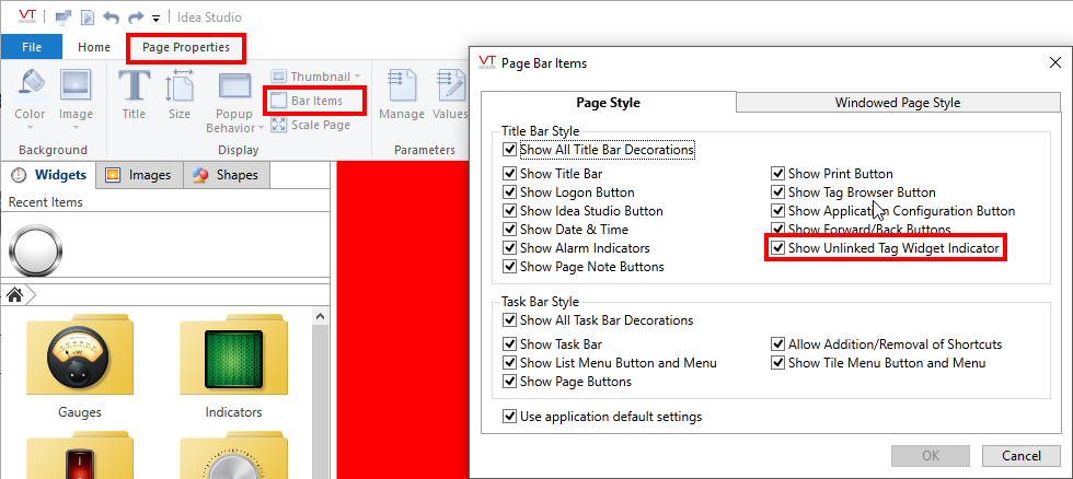 If the displayed page has no unlinked widgets, then the unlinked indicator in the title bar will not show up. In the Idea studio, open the Panel and select the Tag Links tab. If there are unlinked widgets on that page they will show there. If that idicates unlinked widgets and you still can't see it in the title bar, please send us a changeset.
