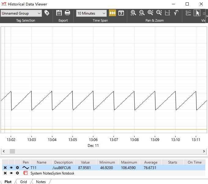 The temperature instrument records data every second. The customer wants to see the curve of the raw data (currently, only a 10-minute historical curve can be viewed). Is it possible to view a longer period of raw data curves without dragging the axes?