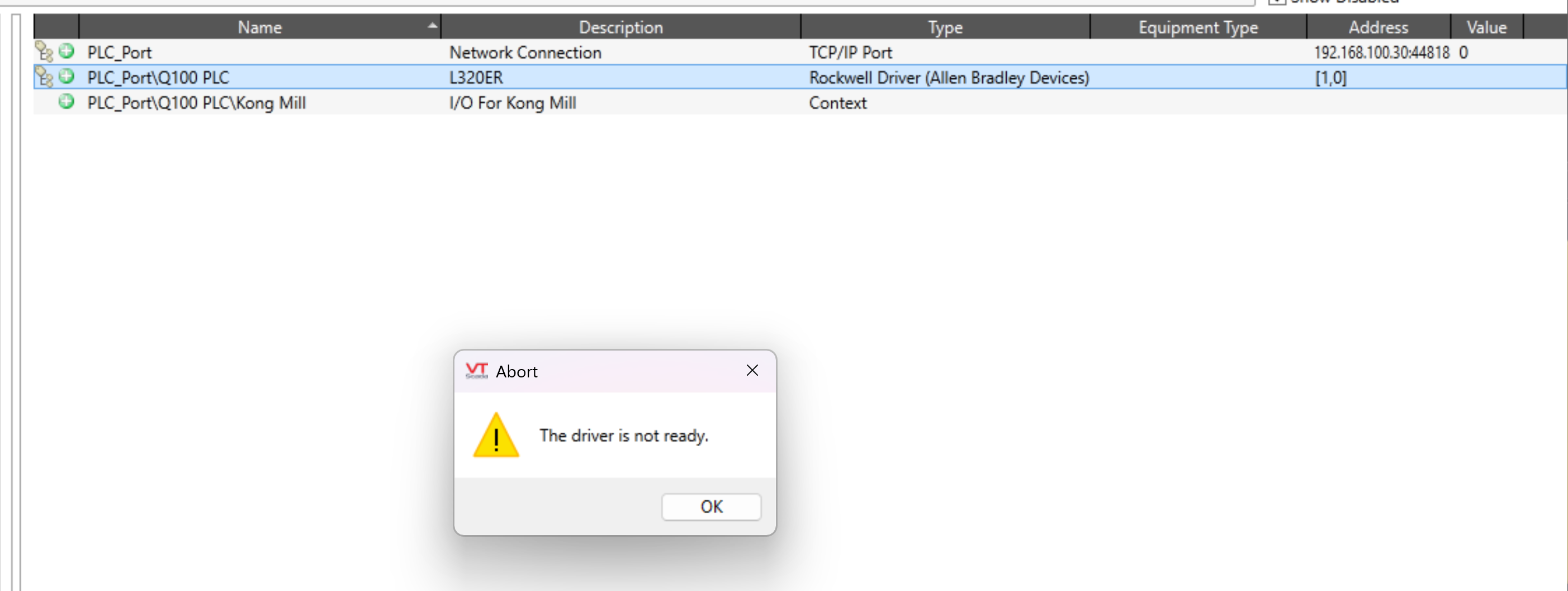 Hello, When trying to setup communications to import tags I am getting an error of "Driver Not Ready". ![694ef6ae48b2a](serve/attachment&path=694ef6ae48b2a) Also, when I try to set up tags individually, the application is unable to read from the PLC to choose the appropriate I/O. ![694ef76cebd2d](serve/attachment&path=694ef76cebd2d) I have noticed that I am not getting a value next to my driver, but I am getting a zero next to my port. I cannot find a reason for a value being blank when using the help files. The only thing I can gather is that my value of zero for the port means it is seeing my PLC successfully, but I have no idea how to get my driver to work. For additional reference I have used the following port segment paths: [1,0] [] Can anyone provide me any further guidance on this please?