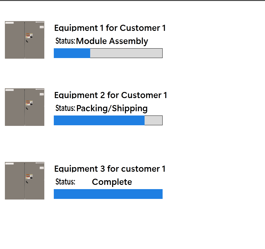 This includes a Level 1 Page for Customer Selection, Level 2 page for Equipment Selection, and Level 3 that includes a widget (String entry for Equipment ID, and Droplist for Process Status for that piece of equipment). I have also setup a Dashboard Page to see all Level 3 widgets for the selected customer.