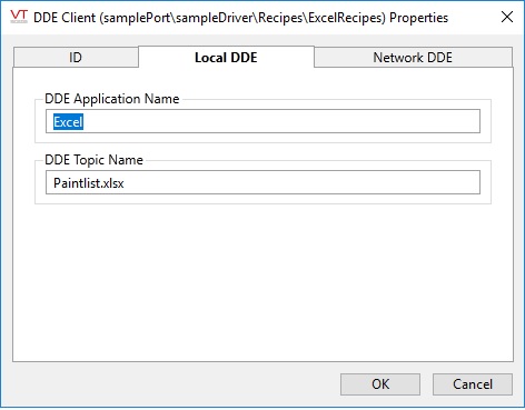 I have a little paint shop example app which uses DDE which you can use as a template. The DDE tag is called ExcelRecipes and it connects to a *.xlsx which lives in the application directory. Another important note is that for DDE, the excel sheet needs to be converted from the typical format to RC format. ie: C2 maps to R2C3 an image of my DDE tag configuration is below: ![5be457eb2ce62](serve/attachment&path=5be457eb2ce62) Here is an image of the sample application with the DDE portion highlighted: ![5be4580910781](serve/attachment&path=5be4580910781) You can download my sample application here: https://drive.google.com/open?id=1yrEUeySnINL0Nx2IcQ42_rF-mTI52il1 *See the included ReadMe.txt