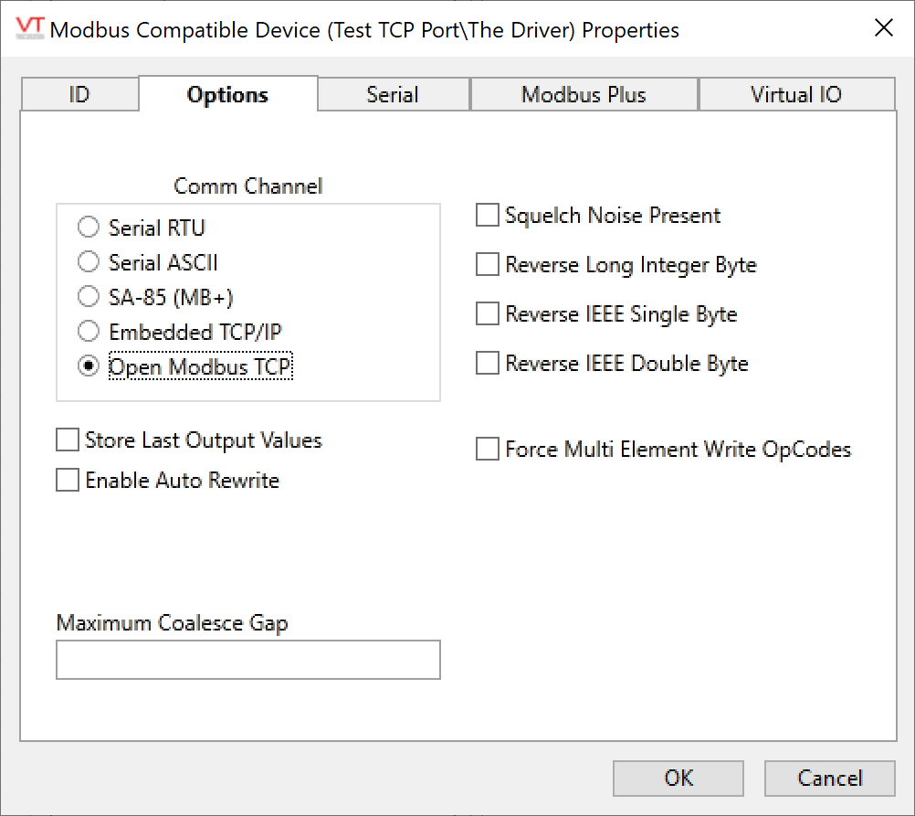 I'm trying to connect to a TCP modbus server running on the same machine as the instance of VTSLite. I've confirmed the server is operating (with a different client), but I can't seem to get my VTS application to write or read any addresses.