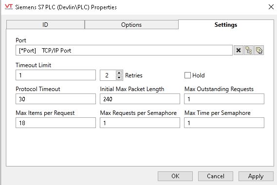 I want to establish a connection with a Siemens Logo! 8 PLC and in VTScada I use the Siemens S7-200 driver, Rack 0 Slot 2, CP Type None, ISO Over TCP.
