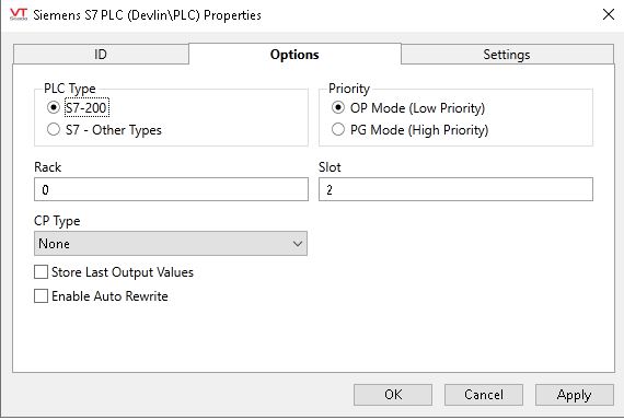 For VTScada the connection is made via TCP/IP Port Number 102 and Driver Siemens S7 PLC Options: S7-200, ISO over TCP, OP Mode, Rack 0 Slot 2, CP Type None, Store Last Output Values.