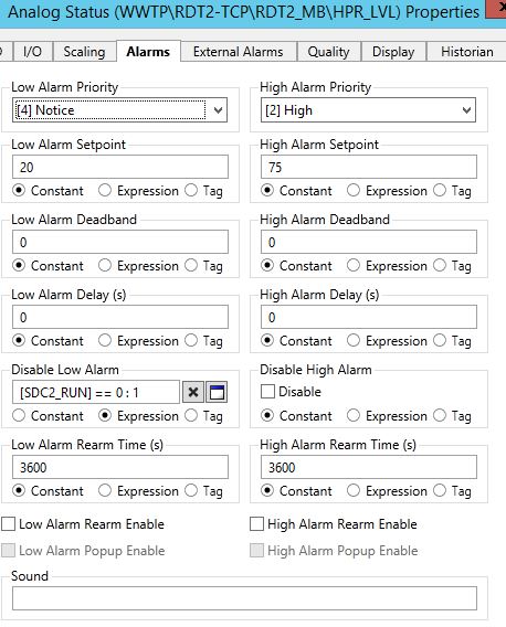 In this example, we're working with an Analog Status tag, where there's a Constant / Expression / Tag selection below the Enable / Disable parameter.