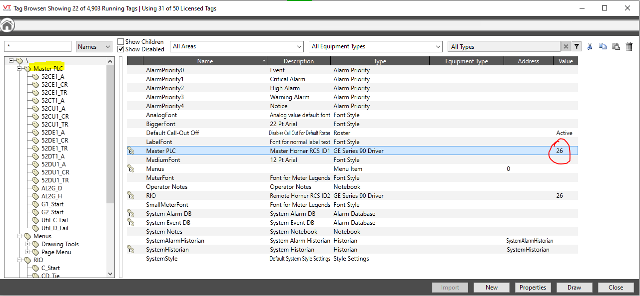 I am in need of help establishing comms to a PLC via the GESRTP driver. I have added a driver to the main area and added children to it as shown in the attached pic. Can anyone tell me what value 26 means in the driver value? If I unplug the PLC the value changes to 2. Also another issue I have is what control do I need to turn on/off bits within the PLC? I have added a toggle switch widget to the project and attempt to assign it a digital tag and VT SCADA gives me an error that the tag does not support the widget. How do I turn on/off say %I1? Thank you