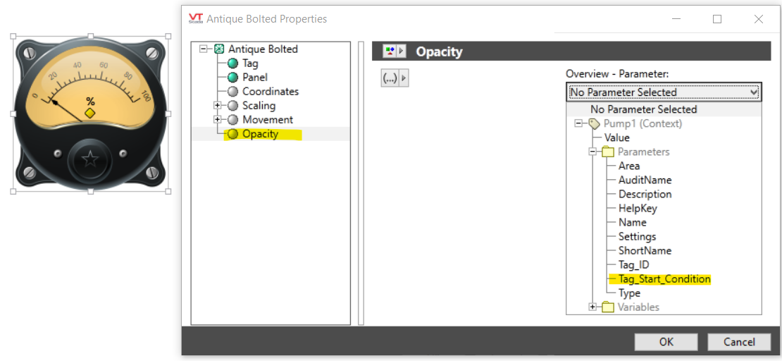 Don't know if it is what you are looking for but for my pumps, I use the "Tag_Start_Condition" parameter tied to the opacity. Below is an example......