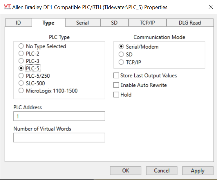2. set the AB driver to PLC/5 and Serial/Modem communications mode on the Type tab