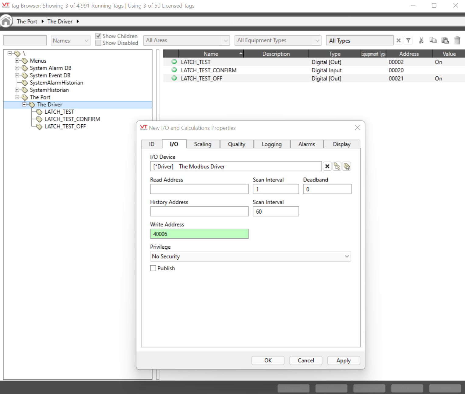 I have configured my Rockwell Micro 820 as a modbus server. I configured my VTSCADA driver tag as a modbus driver tag. i am able to read and write digital to my controller from VTSCADA to the 00000 registers. I am able to read analog from my controller on the 30000 registers in VTSCADA but I am unable to write to my controller on the 40000 registers. I do not have any error codes when i view the driver tag address. I created a new child under the communications driver tag as a I/O calculations tag and drew a numeric entry widget. How do I write to my controller?
