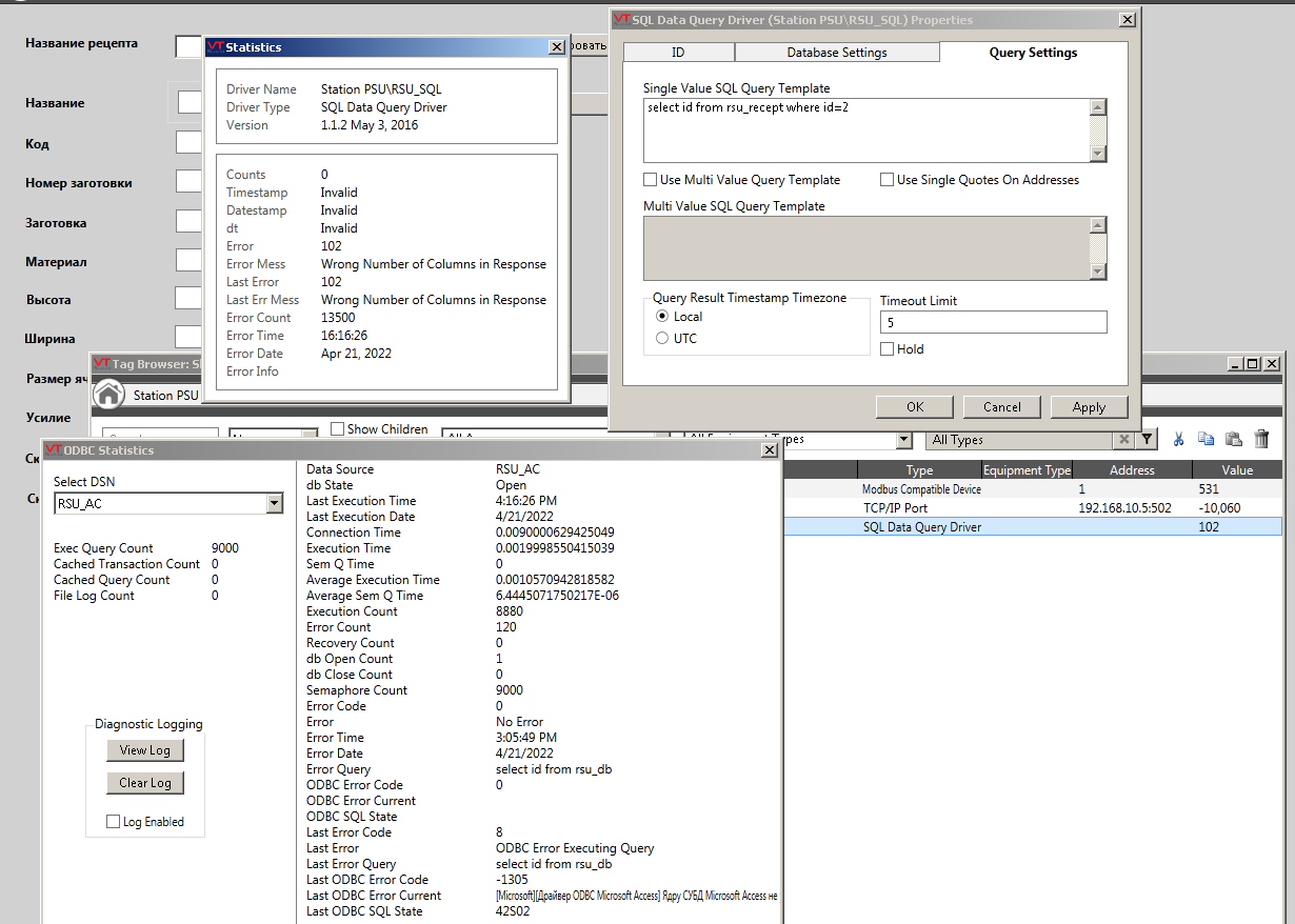 Please give advice on setting up the SQLDataQueryDriver. Table to store your data. MSAccess, The driver is configured in ODBS. When connected, it gives status 102. VT SCADA Light!