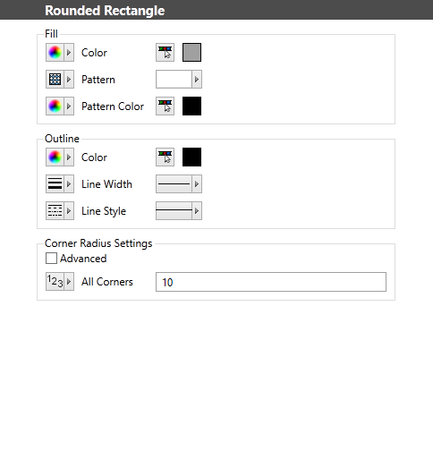 Inside the studio there are the default shapes in the shape tab. When using these shapes I noticed that the only shapes with the options for Fill Pattern, Fill Pattern Color, Outline Line Width, and Outline Line Style (see image below) are only available on the Rounded Rectangle (the default 4 corner, and the default 2 corner) is there a way to get these options on the other shapes? It would be nice to have that came control on a circle or a triangle, or even a shape that I make using the line tool.